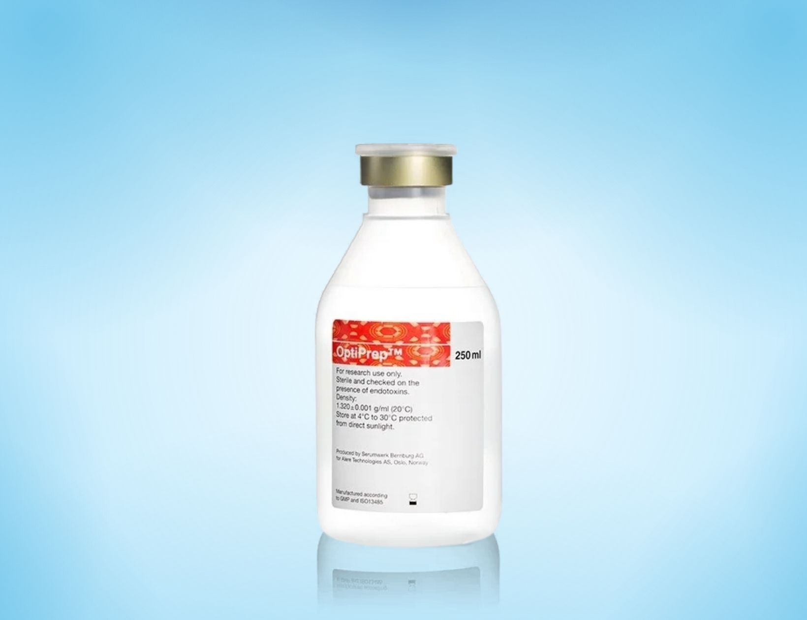 OptiPrep™ is a ready-made, sterile and endotoxin-tested solution of iodixanol use as a density gradient medium recommended for the isolation and purification of DNA or RNA viruses, organelles such as nuclei, mitochondria, endosomes or exosomes, macromolecules, as well as a wide range of cell types. OptiPrep™ is a non-ionic iodixanol-based medium with a density of 1.320 ± 0.001 g/mL. It has been used clinically in X-ray contrast imaging and has been shown to have lower toxicity compared to ionic gradient compounds such as metrizamide.