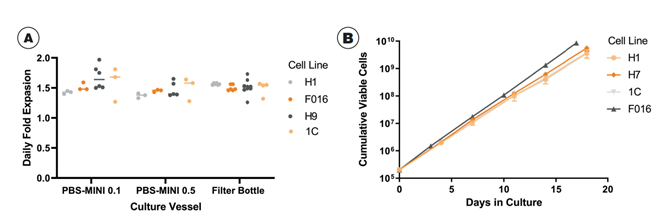 (A) Mức độ tăng sinh hằng ngày của các cụm tế bào hES và hiPS trong mTeSR™3D và TeSR™-AOF 3D trong PBS-MINI.