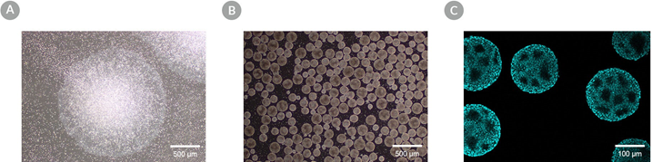 Hình thái đặc trưng của hPSC được duy trì trong quá trình chuyển đổi từ nuôi cấy 2D sang 3D. (A) tế bào hPSCs phát triển trong môi trường nuôi cấy 2D, (B) tế bào hPSCs được nuôi cấy 3D trong môi trường TeSRTM-AOF 3D trong thiết bị PBS Mini Bioreactor; (C) Hình ảnh cụm tế bào 3D nhuộm DAPI cho thấy sự hình thành các khoảng trống đồng nhất.