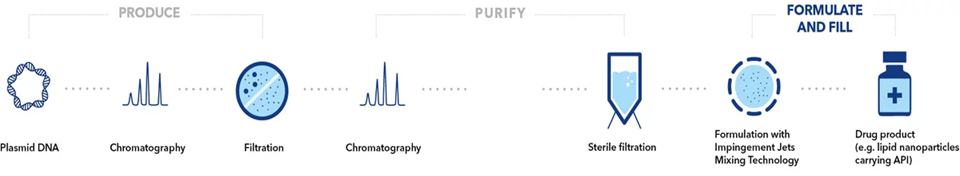 Quy mô sản xuất lớn có thể được cấu hình với tối đa tám đơn vị trộn song song tùy thuộc vào yêu cầu của khách hàng. Mỗi thiết bị bao gồm hai máy bơm để cung cấp các dòng lipid và API, hai đồng hồ đo lưu lượng để kiểm soát dòng chảy và một bộ trộn phản lực. Tùy thuộc vào cấu hình, việc pha loãng trước API và dập tắt có thể được thực hiện cho luồng kết hợp của tất cả các đơn vị trong một bước quy trình bên ngoài thiết bị trộn xung lực phản lực (IJM).