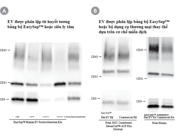 (A) EV được phân lập từ huyết tương bằng Bộ dụng cụ chọn lọc dương tính túi ngoại EasySep™ ở người hoặc siêu ly tâm vi phân ngắn (2 x 70 phút, 100.000 x g), và các phần phân lập được phân tích biểu hiện protein tetraspanin bằng Western blot.