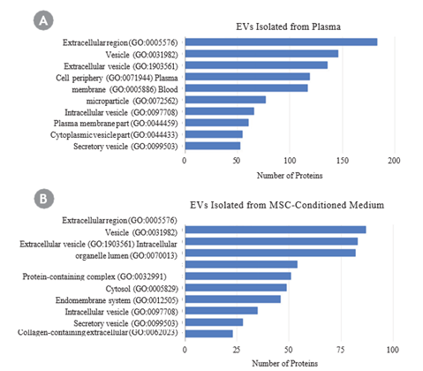 Các protein có trong EV được phân lập từ (A) huyết tương và (B) dịch nổi môi trường nuôi cấy MSC sử dụng EasySep™ Human Pan-Extracellular Vesicle Positive Selection Kit đã được phát hiện bằng phân tích protein. Sau đó, chúng được nhóm theo thuật ngữ Gene Onology của EV, xác nhận chất lượng và khả năng tương thích của EV được phân lập với phân tích khối phổ.