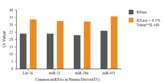 Các microRNA (miRNA) tìm thấy trong EV có nguồn gốc từ huyết tương được phát hiện bằng RT-qPCR chứng minh khả năng tương thích của EasySep™ Human Pan-Extracellular Vesicle Positive Selection Kitvới quá trình chiết RNA và phân tích RNA ở hạ lưu. Sự gia tăng giá trị Ct sau khi ly giải EV bằng cách sử dụng quá trình phá hủy Triton™X-100 và RNase 0,1% chứng tỏ tính toàn vẹn của EV được phân lập.