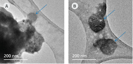Phân tích kính hiển vi điện tử truyền qua (TEM) cho thấy các EV có nguồn gốc từ huyết tương còn nguyên vẹn và có dạng hình cầu (mũi tên). Các EV phân lập được gắn vào phức hợp kháng thể tetrameric và các hạt từ tính.
