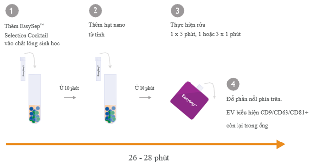 Hình 1. Quy trình phân lập EV khỏi chất lỏng sinh học với Bộ chọn lọc dương tính túi ngoại bào EasySep™ ở người