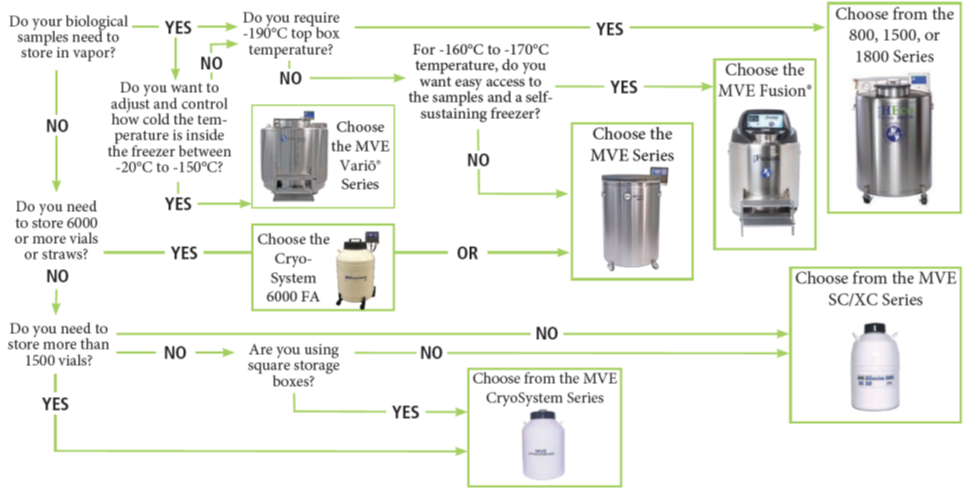 - Nếu bạn muốn điều chỉnh và kiểm soát nhiệt độ lạnh bên trong bình lưu trữ mẫu từ -20°C đến -150°C thì chọn các dòng bình lưu trữ mẫu MVE Variō®.