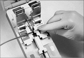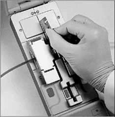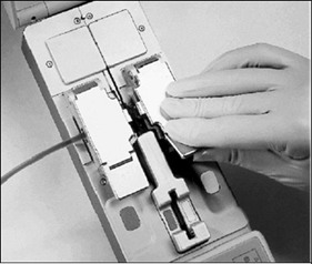 - Điều chỉnh vị trí bộ dao nối sao cho mặt màu xanh lam của bộ khung bọc dao nối khớp với nhãn mã màu ở bên trái của thiết bị.