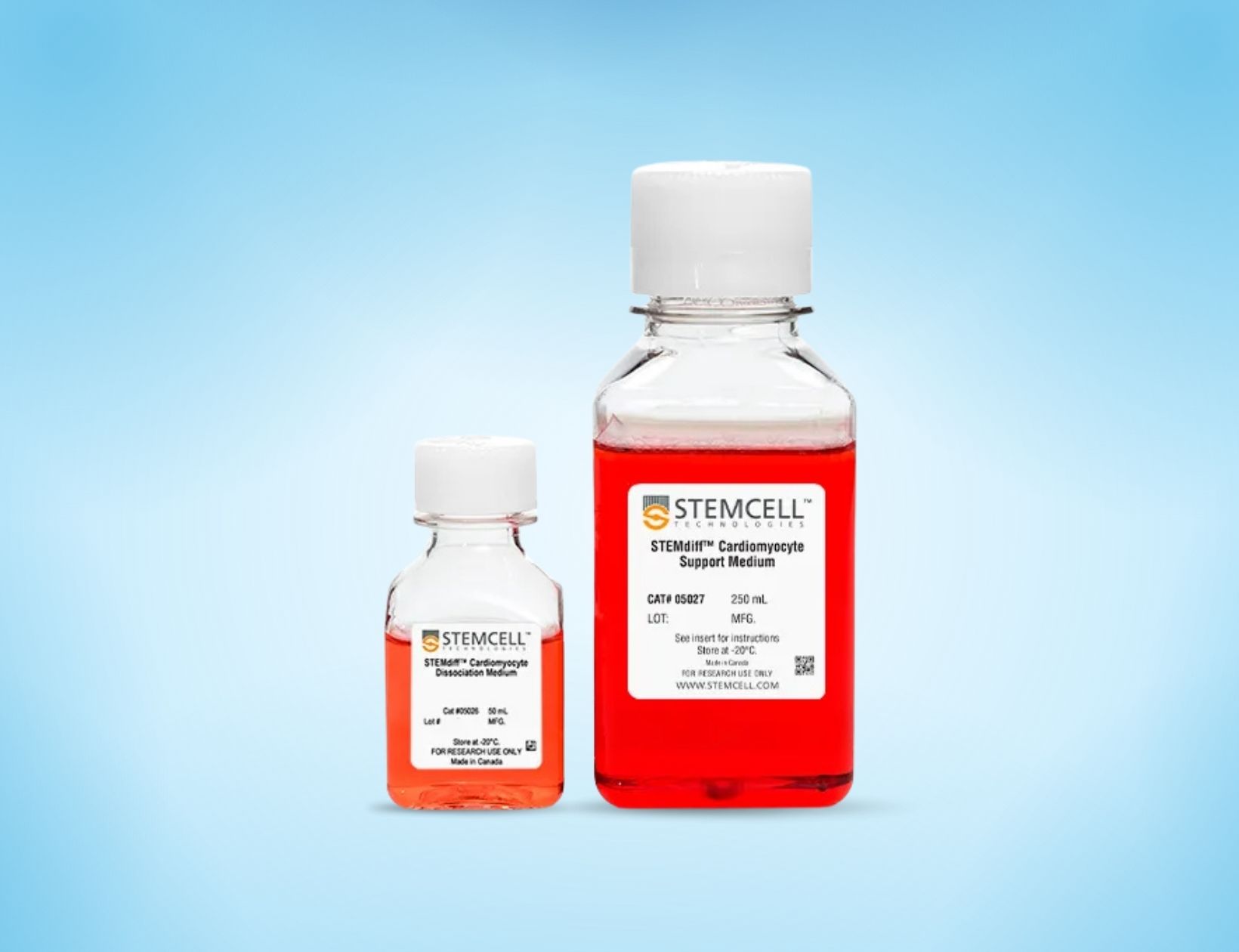 Bộ kit phân tách tế bào cơ tim STEMdiff™ bao gồm môi trường phân tách tế bào STEMdiff™ Cardiomyocyte Dissociation Medium và môi trường hỗ trợ tế bào STEMdiff™ Cardiomyocyte Support Medium.